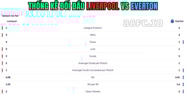 Dữ liệu từ Soccerway cho thấy Everton đã không thắng tại Anfield kể từ năm 1999. Đây là một thống kê đáng chú ý, cho thấy sự áp đảo của Liverpool trên sân nhà trong các trận derby Merseyside.